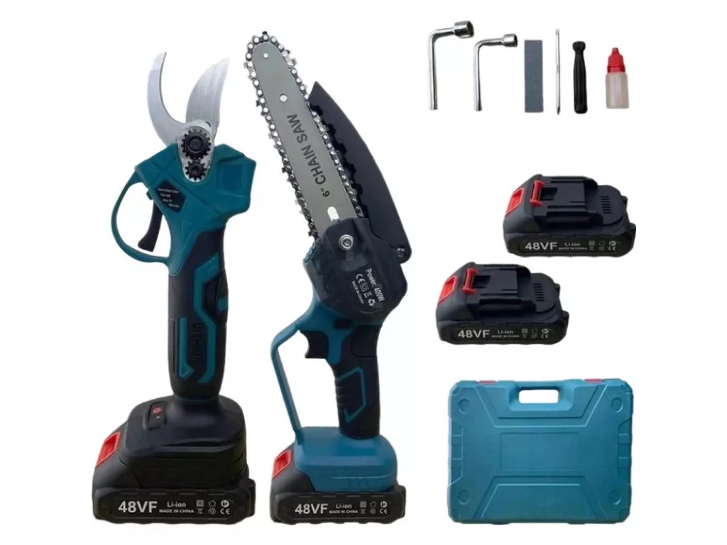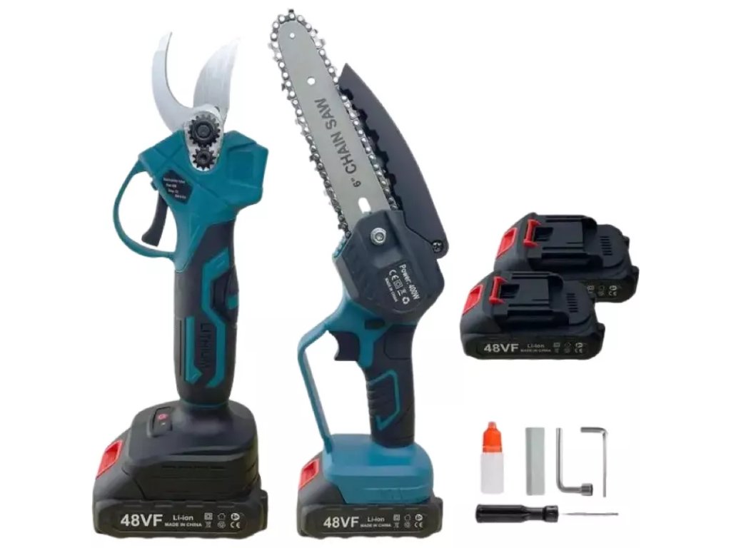Akumulátorová mini řetězová pila + aku nůžky na větve – výkonná sada 48V