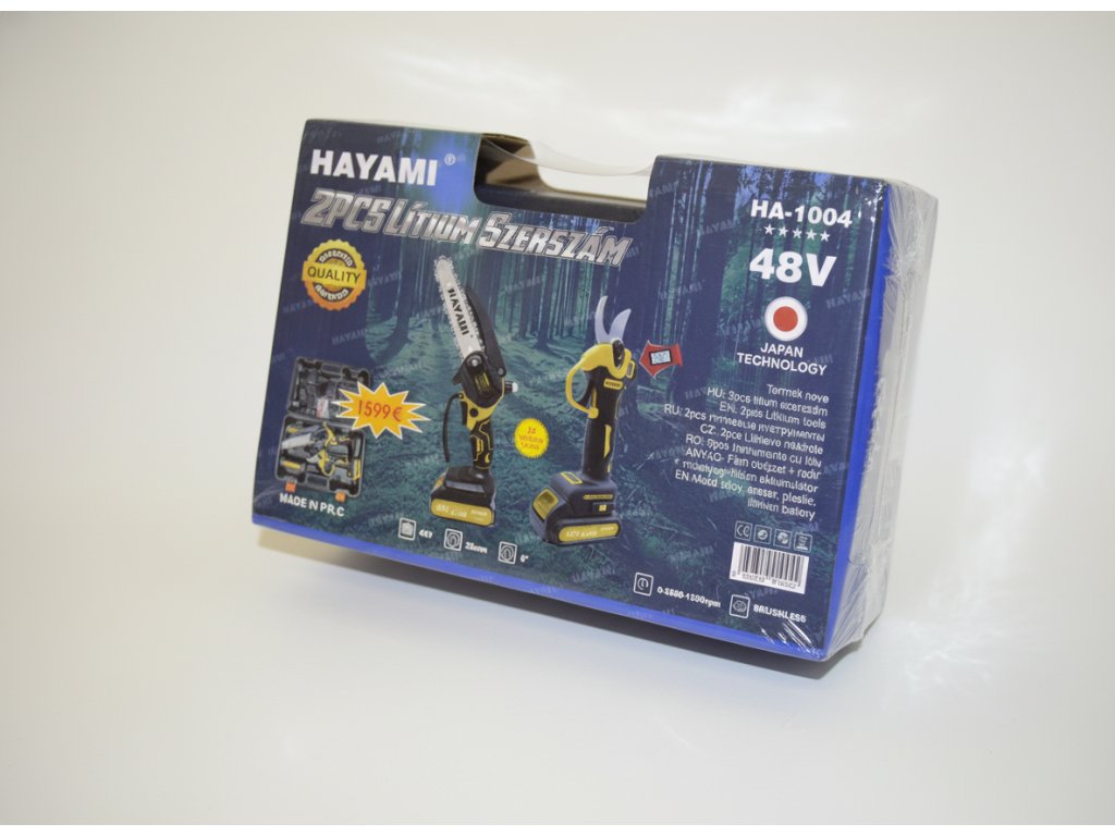 Aku set Hayami 2v1 pilka s automatickým mazáním + aku nůžky 48V v kufříku + 2 baterie a příslušenství
