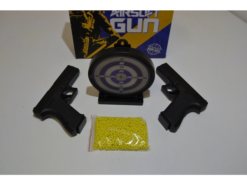 Sada obsauje terč se stojánkem o průměru 16 cm. Plocha terče je gelová samolepící, teže vystřelené kuličky na terči ulpí. Dále balení obsahuje sáček s cca 1000 ks kuliček.