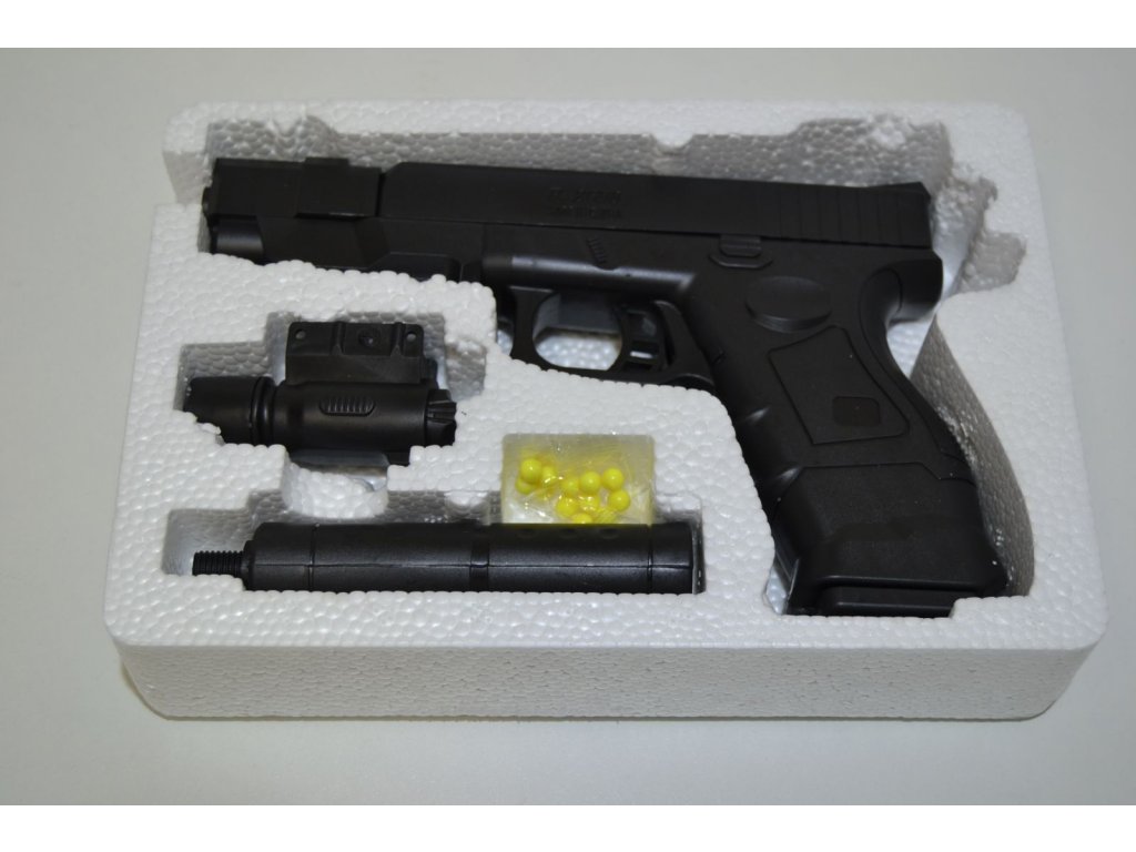 Pistole je vybavena laserovým zaměřovačem a šroubovací imitací tlumiče