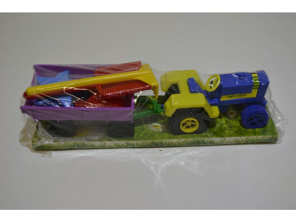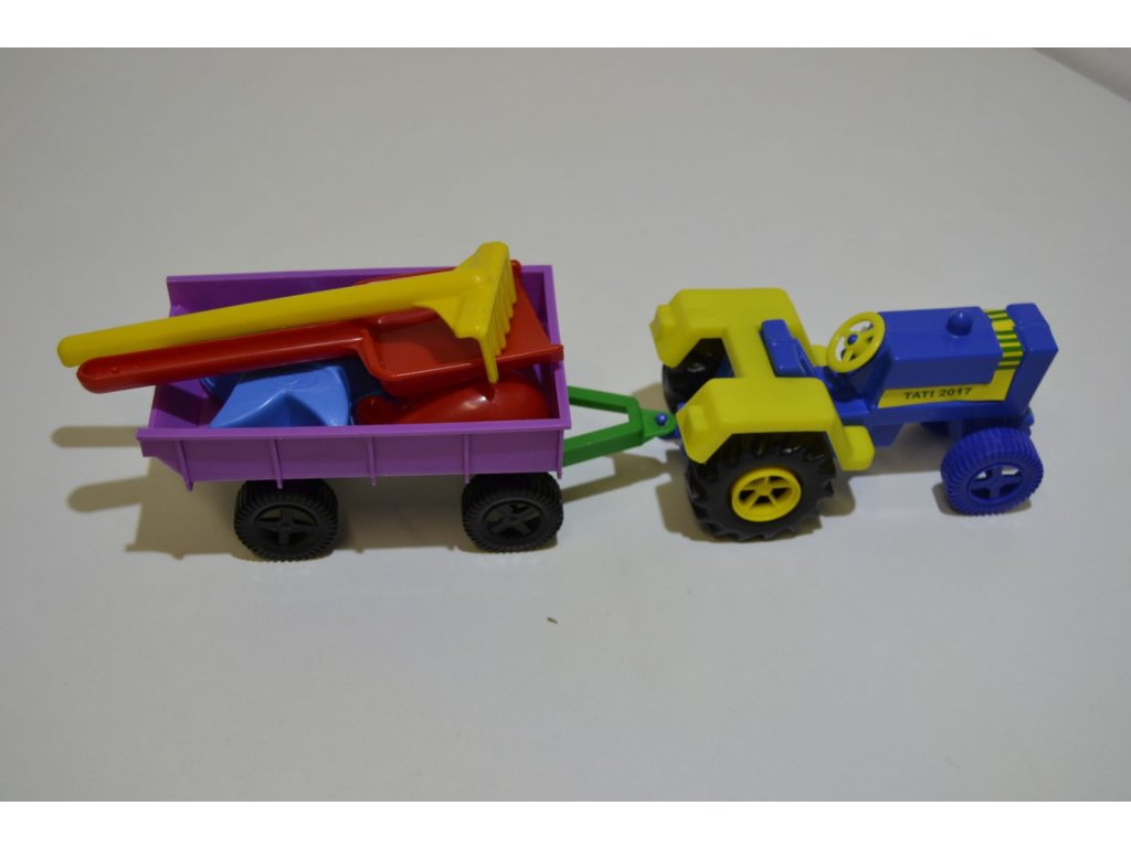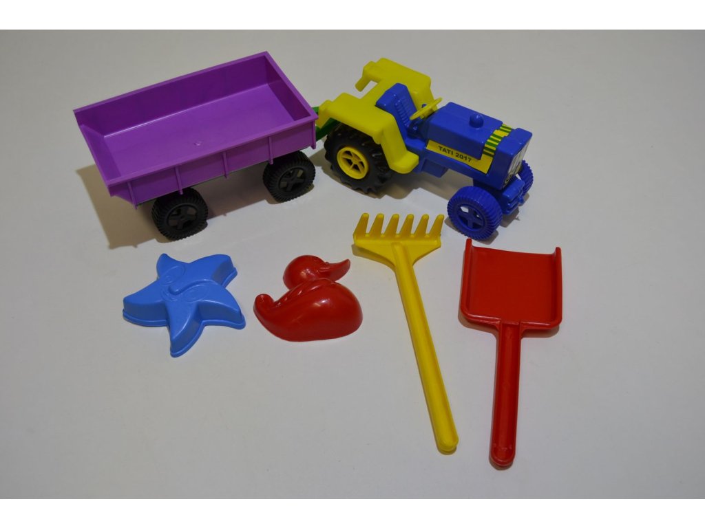 Obsahuje : traktor s vlekem o délce 41cm ( samotný traktor 19cm ), 2 bábovičky, hrabičky a lopatku