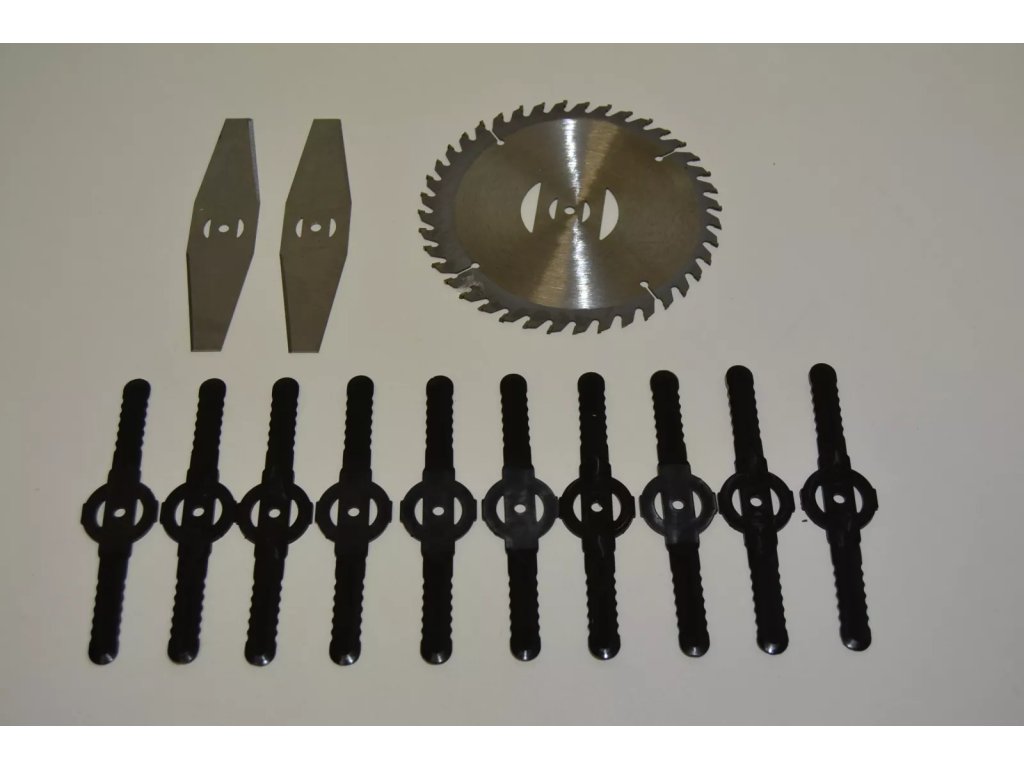 Balení obsahuje 5 ks plastových nástavců na sekání trávy, 2 ocelové nože na drobné křoviny a 1 vidiový kotouč o průměru 150 mm na větší větve a keře.