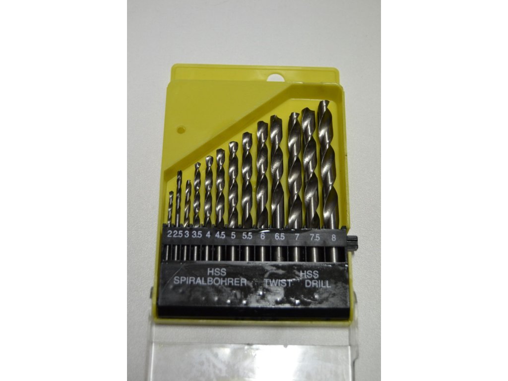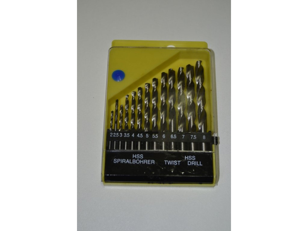 Sada obsahuje vrtáky průměru 2, 2,5, 3, 3,5, 4, 4,5, 5, 5,5, 6, 6,5, 7, 7,5 a 8 mm.