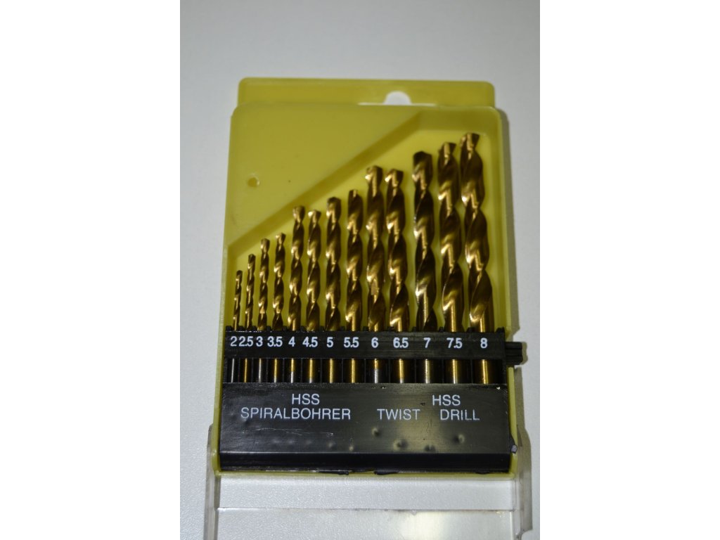 Sada obsahuje vrtáky průměru 2, 2,5, 3, 3,5, 4, 4,5, 5, 5,5, 6, 6,5, 7, 7,5 a 8 mm.