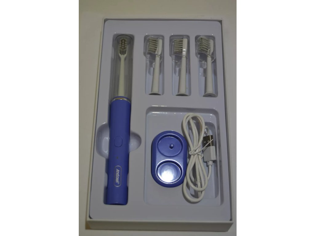 Balení obsahuje : zubní kartáček, 4 výměnné hlavy, dobíjecí základnu a USB kabel.